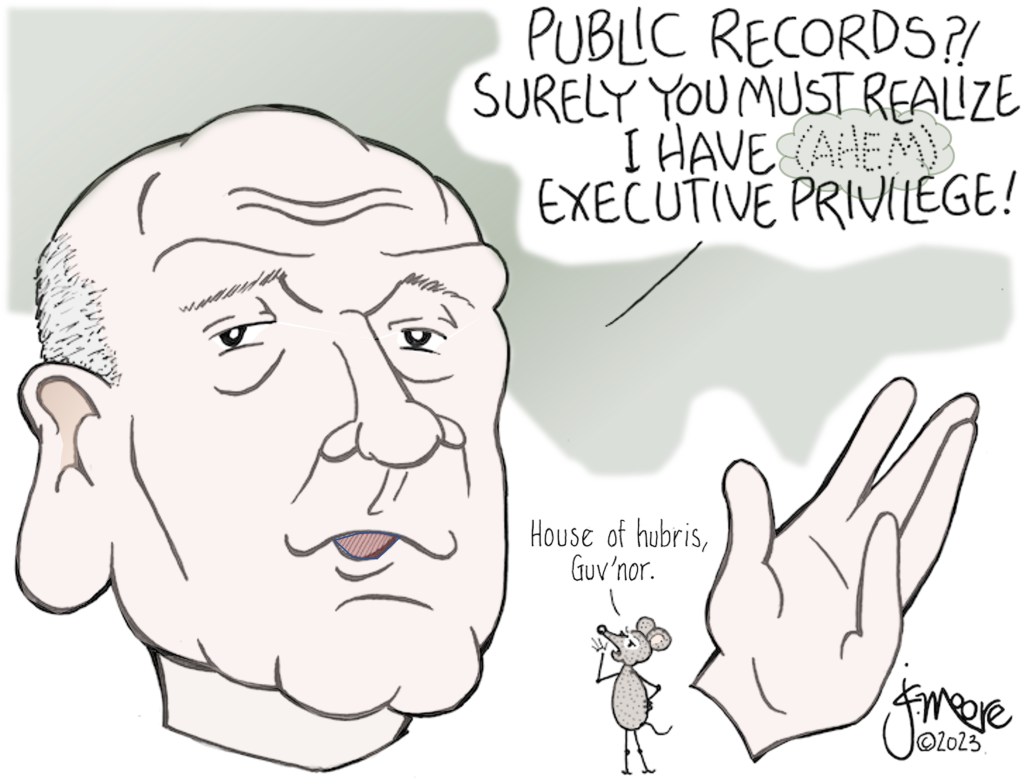 Last December, and again in July, courts ordered the Gianforte administration to release documents. Two separate judges denied the governor’s claim of ‘executive privilege.’ Still, in a recent lawsuit seeking a different set of records, the administration stands by its spurious claim. (With minor changes, this cartoon repeats one from a year ago.)