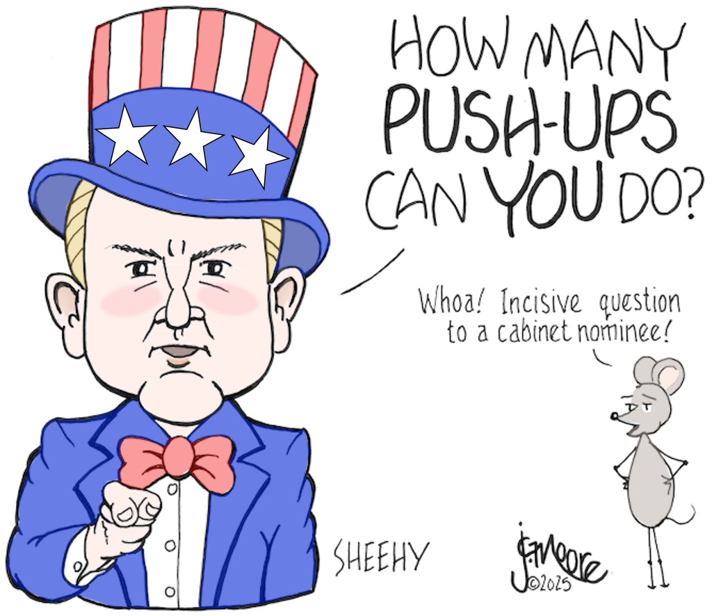 Brightitude January 18, 2025 ~ jcolemanmoore Newly minted US Senator TImmy Sheehy asked this question of Pete Hegseth, nominee for Secretary of Defense. Share this: Click to share on X (Opens in new window) X Click to share on Facebook (Opens in new window) Facebook Like Loading... Related Published by jcolemanmoore View all posts by jcolemanmoore
